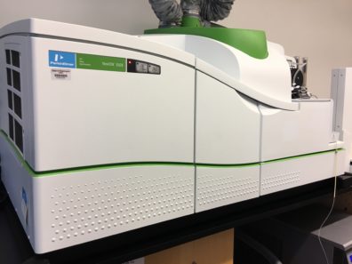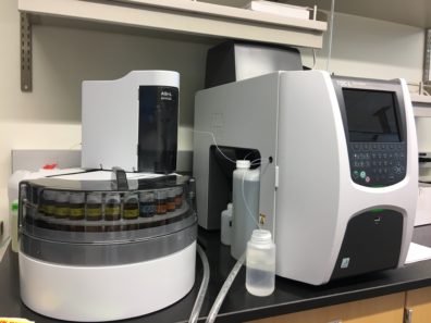 The Perkin Elmer NexION 350X is an ICPMS capable of running in both standard and collision cell mode for the reduction of polyatomic interferences common with elements such as iron. In addition, this instrument is capable of doing single particle analysis for detection of metal based nanomaterials. A wide range of elements can be analyzed on this instrument.