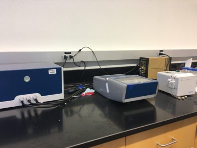 Biolin Scientific’s Q-Sense is a Quartz Crystal Microbalance with Dissipation Monitoring. This allows real time monitoring of surface interactions with nanogram precision for a variety of samples and experimental set ups. Q-Sense is capable of making measurements of frequency and dissipation at the fundamental frequency (4.95 MHz) as well as the 3rd through the 13th overtones. A wide variety of pre-coated sensor types are available from Biolin Scientific allowing the user to select an ideal substrate for their experimental set up. This real time surface sensitive technique can be used to monitor thin films and surface interactions such as adsorption, desorption, molecular interactions, and structural properties. It is equipped with the Electrochemistry Module and a Gamry 600 Potientiostat allowing the users to investigate the electrochemical properties of these surface interactions as well.
